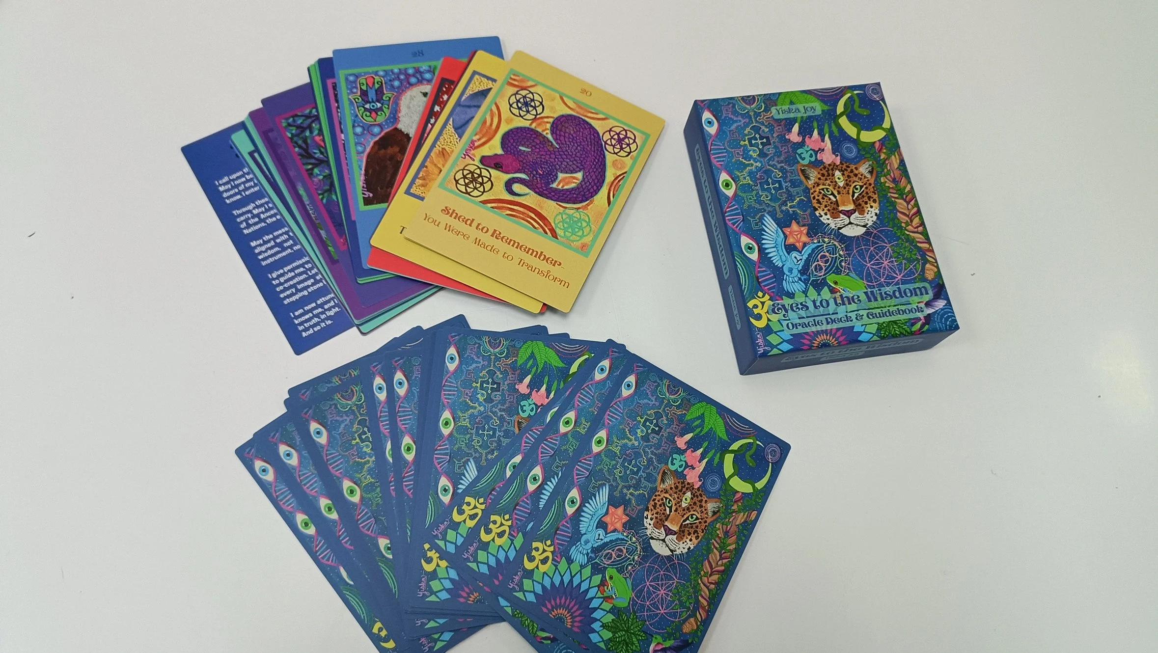 This oracle deck is a sacred gateway to higher consciousness, a tool for unlocking the wisdom that has always existed within you. Like the third eye of the jaguar, it invites you to see beyond illusion, to trust your intuition, and to embrace the guidance woven into the fabric of existence. Each card is a reflection of the cosmic and natural forces that guide your path- encoded in sacred geometry, animal totems, and ancient symbols. Like the hummingbird’s dance with the unseen, this deck whispers messages of synchronicity, transformation, and divine flow. The jungle, the stars, the DNA of the Universe, they all speak through this deck. As you shuffle these cards, you are not merely seeking answers, you are remembering. Remembering your own power. Remembering the wisdom held deep in your soul.